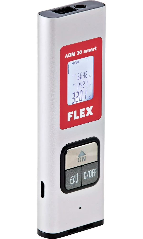Laserový merač vzdialenosti ADM 30 SmartS integrovaným Li-polymér akumulátorom na výpočet dĺžok, plôch a objemov - určovanie hodnôt pomocou nepriameho merania vzdialeností (jednoduchá aj dvojitá Pytagorova veta). Kontinuálne meranie a rýchle stanovenie rozmerov v interiéri. Je ideálny na meranie v ťažko dostupných miestach. Je vybavený intuitívnym ovládaním a kvalitným hliníkovým telom. Prepínateľné jednotky merania m/mm, palce/stopy, má automatické vypnutie, vrátane kábla s Micro-USB na nabíjanie. S nízkou hmotnosťou iba 38 gramov, na merania dĺžky do 30 metrov s presnosťou ± 3 mm.