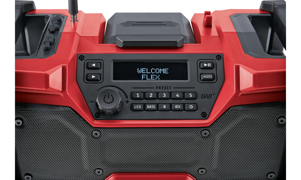 S osvetleným LCD displejom, farebnými LED prúžkami, sklopiteľnou anténou. S integrovanou technológiou Bluetooth®, AUX vstupom, USB pripojením a možnosťou dobíjania smartfónov, tabletov. Automatické vyhľadávanie staníc a 5 kanálov na uloženie staníc. LED – ukazovateľ stavu kapacity akumulátora. FLEX Aku-systém: prevádzka so všetkými FLEX 10,8 V a 18,0 V akumulátormi. Balenie obsahuje 1×napájací adaptér 18.0V a 1×AUX-kábel.TECHNICKÉ PARAMETRE: