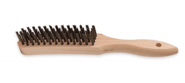 drôtená ručná kefa 4-radová z inoxových štetín priemeru 0,35 mm na drevenej rukoväti.