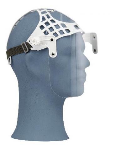 Číry ochranný štít z plexiskla na ochrana zraku proti projekcii malých pevných častíc. Nastaviteľný, s náhlavným krížom.