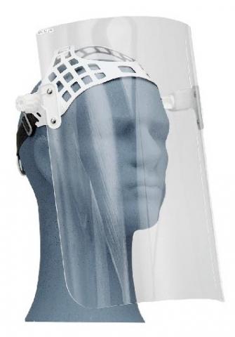 Číry ochranný štít z plexiskla na ochrana zraku proti projekcii malých pevných častíc. Nastaviteľný, s náhlavným krížom.