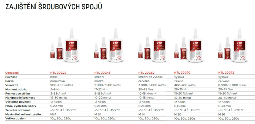 HTL 20G43 je jednozložkové priemyselné lepidlo na zaistenie skrutkových spojov strednej pevnosti. Vytvrdnutie produktu (polymerizácia) prebieha bez prístupu kyslíka (anaeróbne) a za katalytického pôsobenia kovu (stykom s kovom). Tesní a zaisťuje široké spektrum skrutkových spojov. Vyznačuje sa vynikajúcou chemickou odolnosťou, odolnosťou voči vibráciám a vysokým teplotám.10g fľaštička