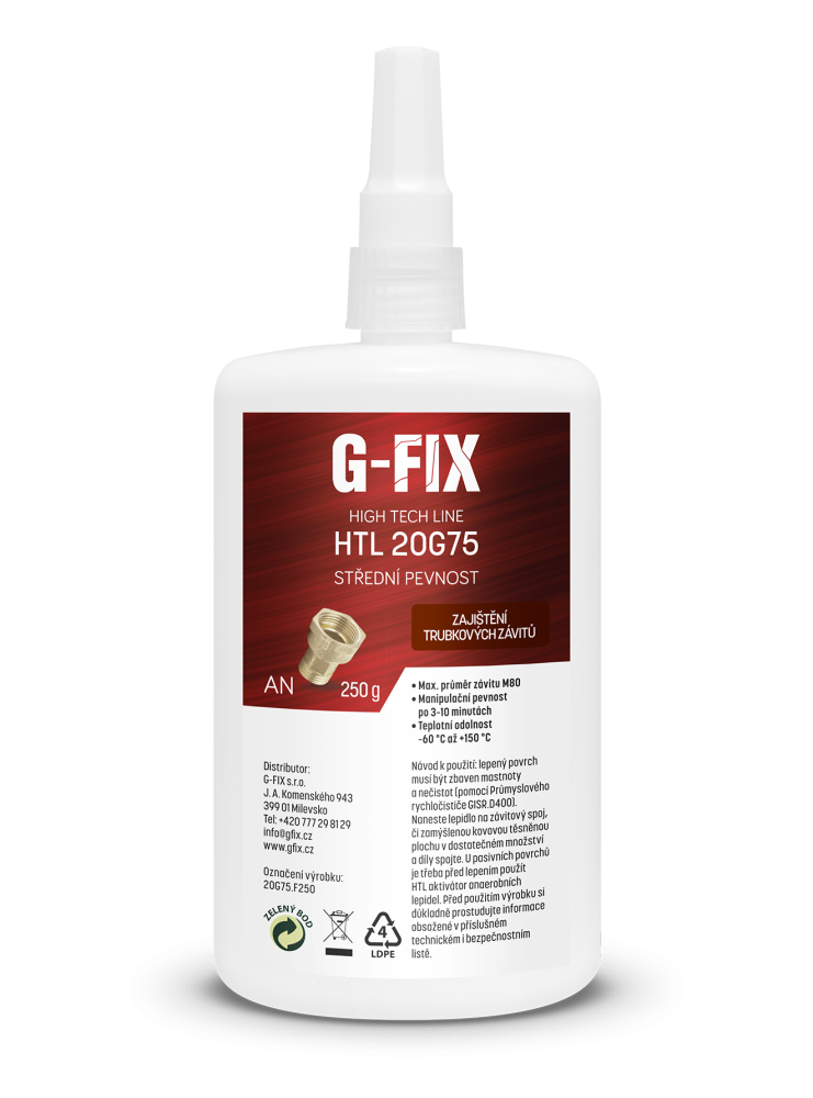 HTL 20G75 je jednozložkové priemyselné lepidlo na zaistenie skrutkových spojov a rúrkových závitov vysokej pevnosti. Vytvrdnutie produktu (polymerizácia) prebieha bez prístupu kyslíka (anaeróbne) a za katalytického pôsobenia kovu (stykom s kovom). Tesní a zaisťuje široké spektrum skrutkových spojov a rúrkových závitov. Vyznačuje sa veľmi dobrou chemickou odolnosťou, odolnosťou voči vibráciám a vysokýmteplotám.