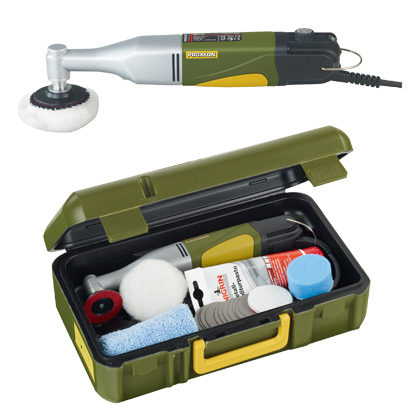 DC motor s vyváženým rotorom; plynulá elektronická regulácia otáčok od 800-2500 rpm. Precízny hriadeľ z brúsenej ocele uložený v guľôčkovom ložisku a hlava z pevného Al odliatku. Telo z polyamidu spevneného sklenými vláknami. Balené v ochrannom plastovom kufríku s originálnym príslušenstvom: gumový kotúč, leštiaca špongia (stredná tvrdosť), leštiace rúno, leštiaca plsť (stredná tvrdosť), brúsny kotúč - 12 ks a handrička z mikrovákna.* napätie: 220 - 240 V